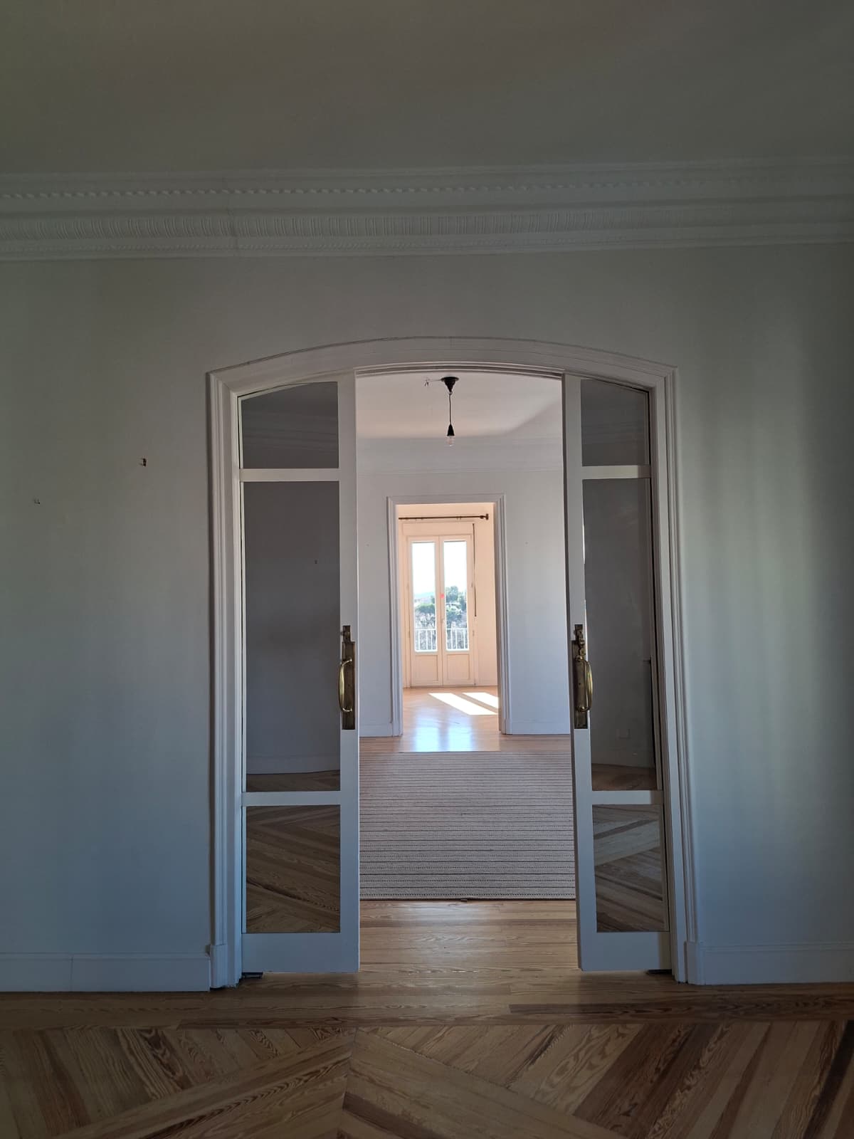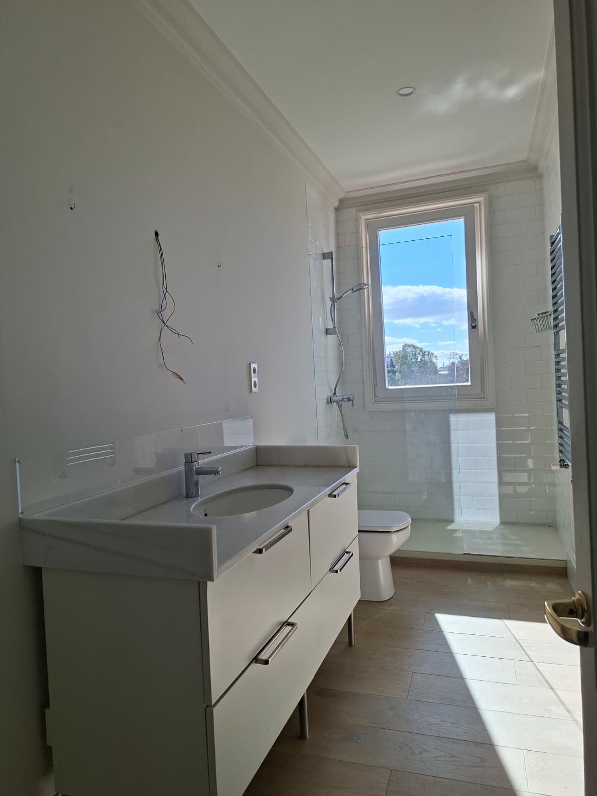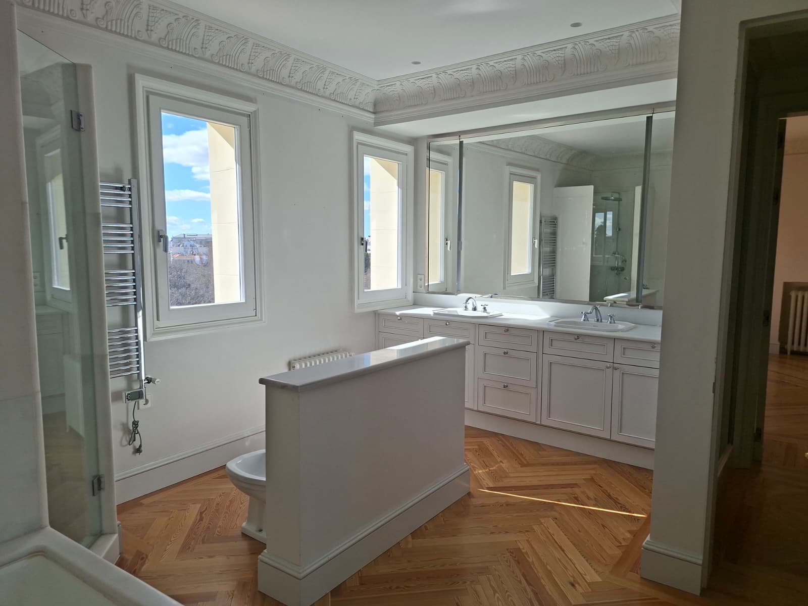 The property stands out for its generous proportions, refined layout, and classic character. It features a master bedroom en suite, complete with a private bathroom and walk-in dressing room, providing maximum comfort and privacy. In addition, there is a second bedroom with a full bathroom off the hallway, a third bedroom adjacent to the kitchen, and a service bedroom with its own en-suite bathroom, seamlessly integrated into the service zone.