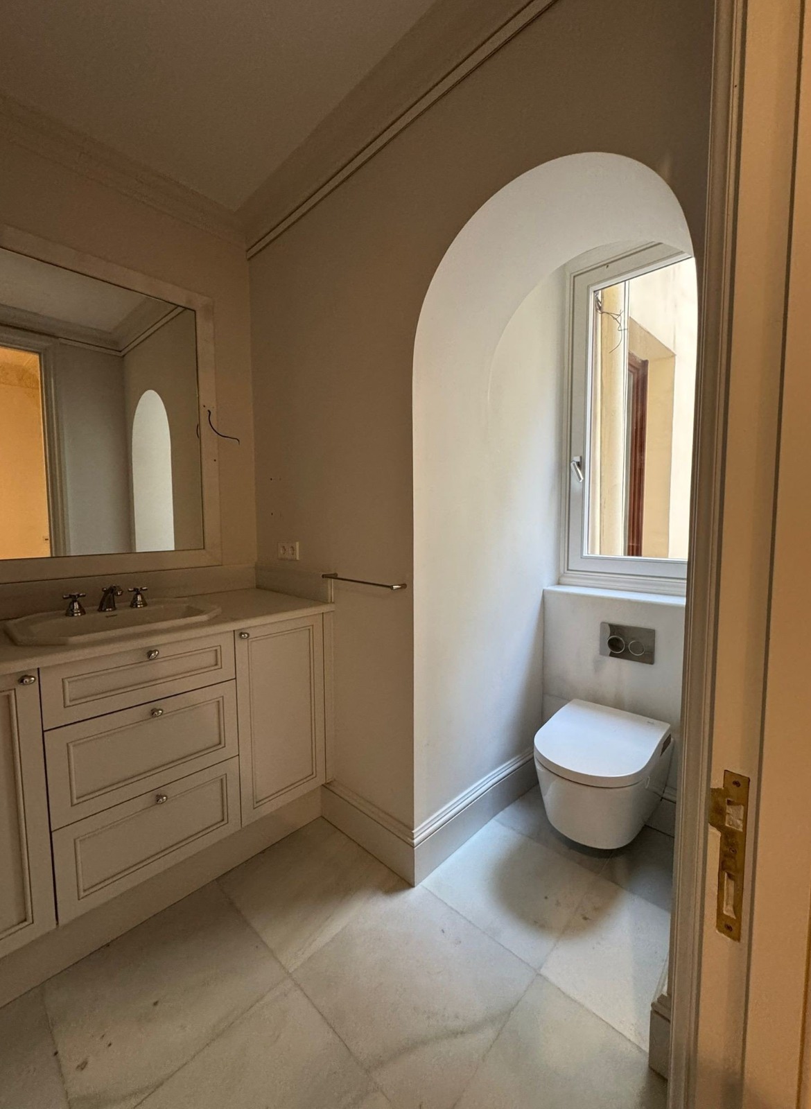 The property stands out for its generous proportions, refined layout, and classic character. It features a master bedroom en suite, complete with a private bathroom and walk-in dressing room, providing maximum comfort and privacy. In addition, there is a second bedroom with a full bathroom located off the hallway, a third bedroom adjacent to the kitchen area, and a service bedroom with its own en-suite bathroom, seamlessly integrated into the service zone.